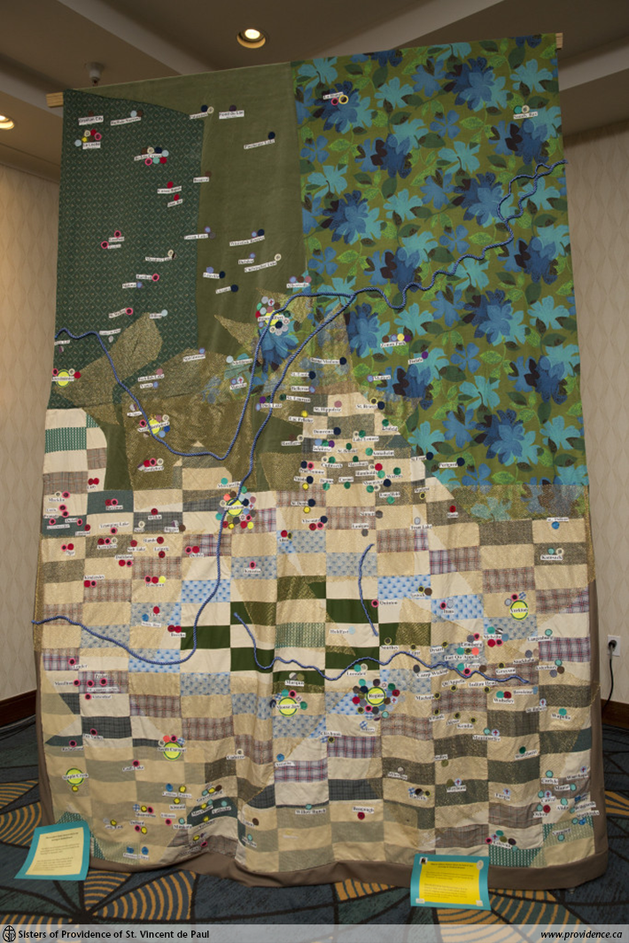 Throughout the conference, a map-like quilt of the province was on display. Created by Sister Sylvia Obrigewitsch, NDS, religious orders are represented by circles of fabric marking the locations of their service. It is a beautiful representation of the contributions of female religious orders in the province. The Sisters of Providence of St. Vincent de Paul are represented by a blue circle in Moose Jaw.