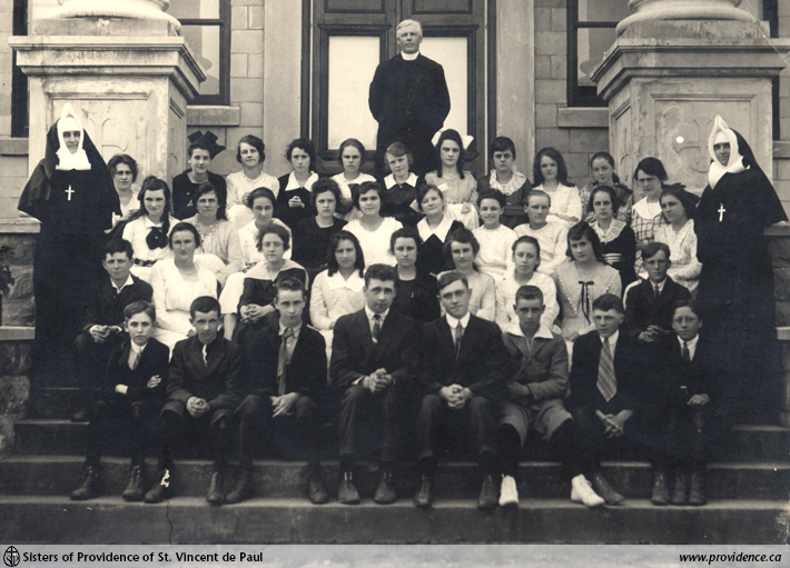 Maryvale Abbey, Glen Nevis, ON, Spring 1919, Back: Msgr. D.R. Macdonald; Left: Sr. Mary Jerome O’Reilly; Right: Sr. Mary Edna O’Meara; Front row, left to right: Homer Rozon, Steve McGillis, Donald J. McDonald, John Chisholm, Allan Blair, Eugene McDonell, Aurele Laframboise, Angus Ranald McDonald; Second row, left to right: Donald McRae, Tena McGregor, Eva Kirby, Dora McDonald, Dolores McDonald, Cecilia McDonell, Lucille Compeau, Katherine McDonald, Lionel Major; Third row, left to right: Margaret McLaughlin, Anna McDonald, Hilda McMillan, Flora McKinnon, Alice Lagroix, Helen Beehler, Christina McDonald, Lillian Bathurst, Edith Purcell, Mary Walsh; Fourth row, left to right: Jeanette McRae, Mary Galvin, Stella McDonell, Mary Clement, Violet McIntosh, Winnie Diffley, Janet McDonald, Mary Williams, Kathleen Cafferty, Dorothy Coyne, and Effie McRae. (SPSVPA 014-207.1.4-9)