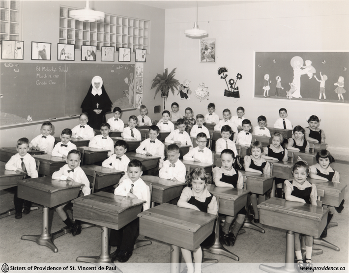 Sr. Mary Lorraine Chapelle with her grade one class at St. Malachy’s School on March 19, 1958. The Sisters of Providence taught at St. Malachy’s school from 1953 to 1971. (SPSVPA 014-213.2.6-9)