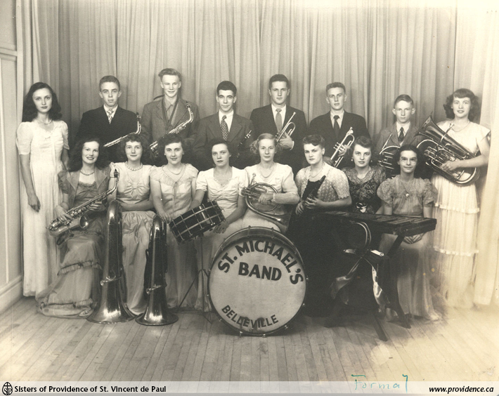 St. Michael’s Band, a rhythm band, was formed in 1934 in Belleville by Sister Mary Mercedes. The students were originally recruited from Grade 1 at St. Michael’s Academy and many of the same children stayed in the band into their high school years. The band played for the King George V and Queen Elizabeth (who we know as the Queen mother) outside St. Mary’s Cathedral during the royal visit to Kingston in 1939. The band also participated in and won awards at the prestigious annual Waterloo Music festival. Here are two photos of the band approximately 10 years apart. 11 members of the band are in both photos.