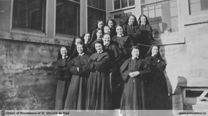 Postulants in 1933 standing on the stairs by the sunroom.