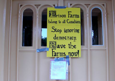 A sign was hung on the door of Correction Canada’s headquarters. It reads: ‘Prison Farms belong to all Canadians. Stop ignoring democracy. Save the Farms NOW!’