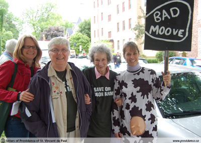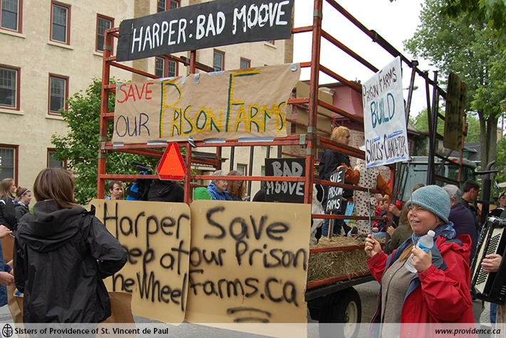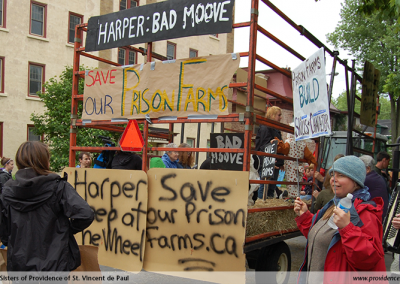 On March 30th a group, including farmers, ex-inmates, Sisters of Providence and a donkey, drove up to Ottawa to address the Public Safety Parliamentary Committee. Sr. Pauline spoke at the hearing and asked “that a moratorium be placed on any dismantling until independent experts have had an opportunity to review the value of the farm program.”